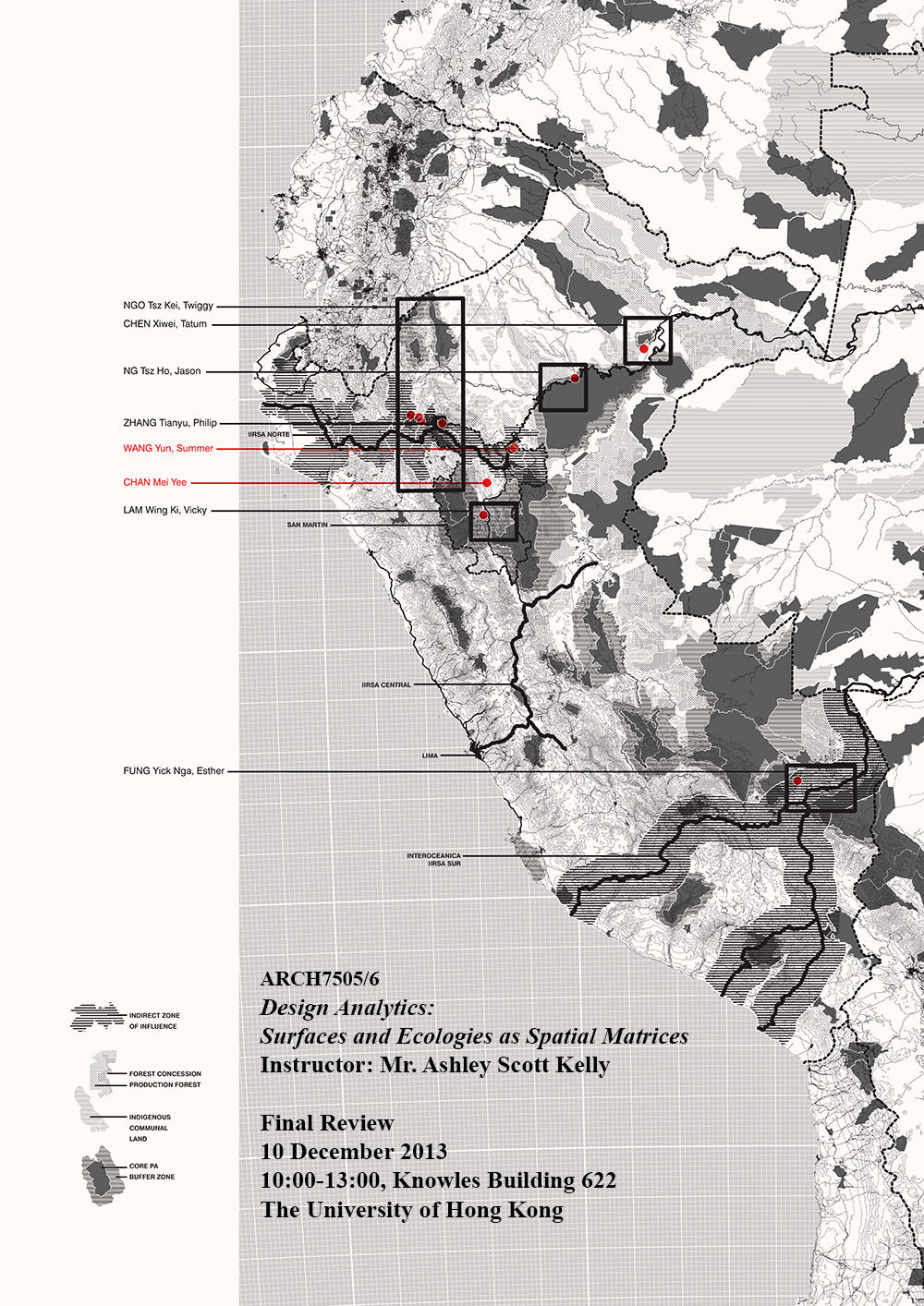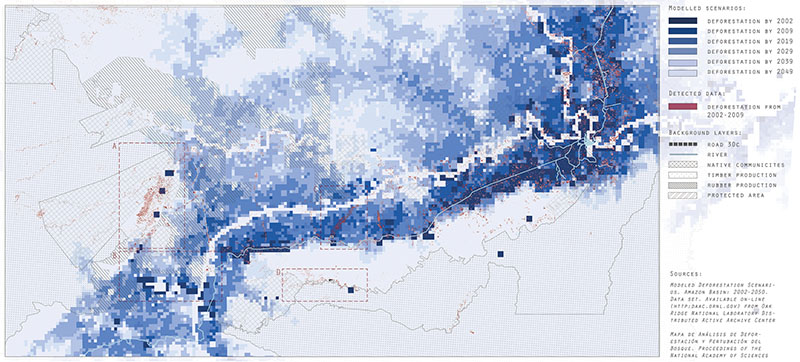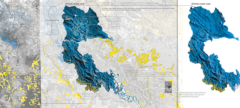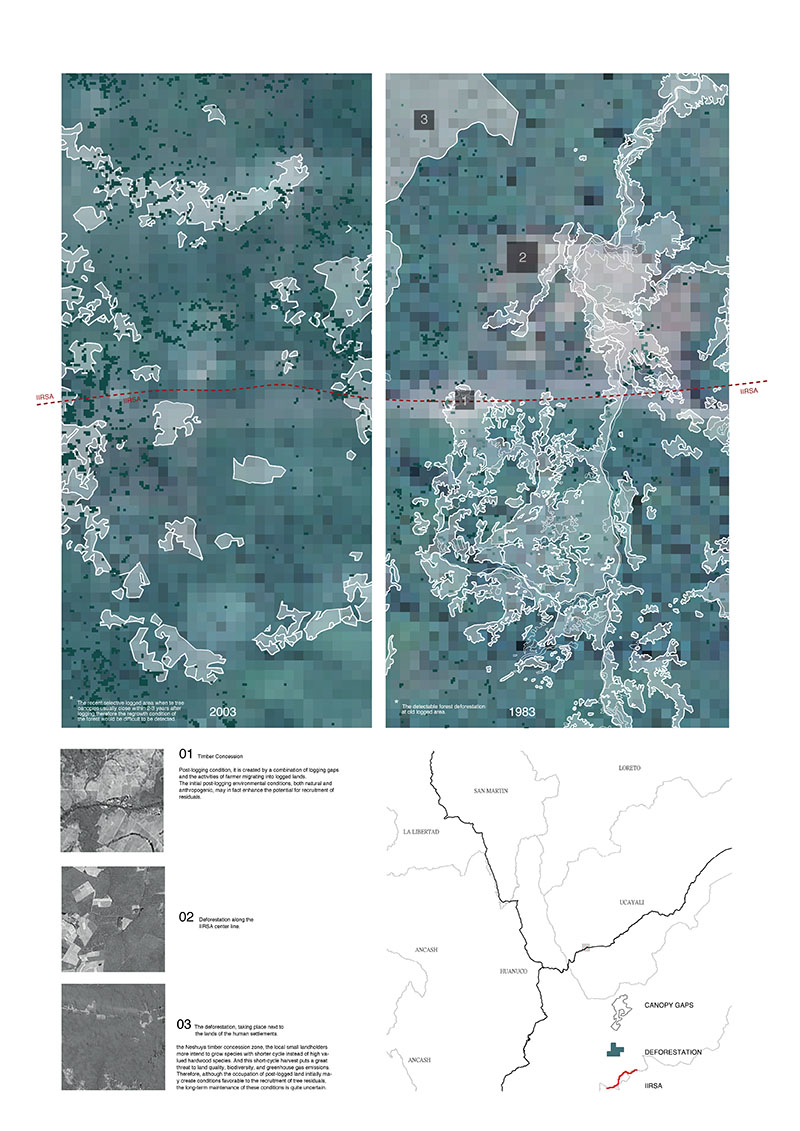 Design, as do many disciplines, has a difficult relationship with nature. It's also difficult to commit the act of "design" in places detached from the urban, such as national parks. This advanced computation-theory seminar follows Chinese infrastructure investment into the world's most biodiverse regions to explore the potential of computational design for supporting environmental conservation. Laura Kurgan noted in her 2004 exhibit "Monochrome Landscapes" that territories of a single color, such as the Amazon, are often the most contested. For their term projects, students visually narrate the dynamics of such densely mosaicked landscapes in the Peruvian Amazon: Forests, logging, degradation, and settlements implicated by a transoceanic highway that crosses coastal desert, highland, montane and cloud forests, and the Amazon Basin.