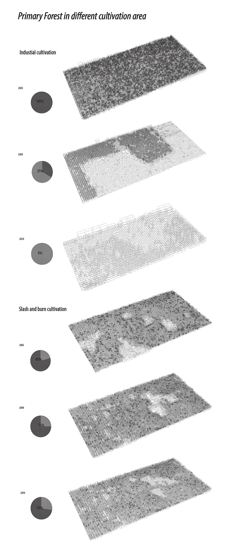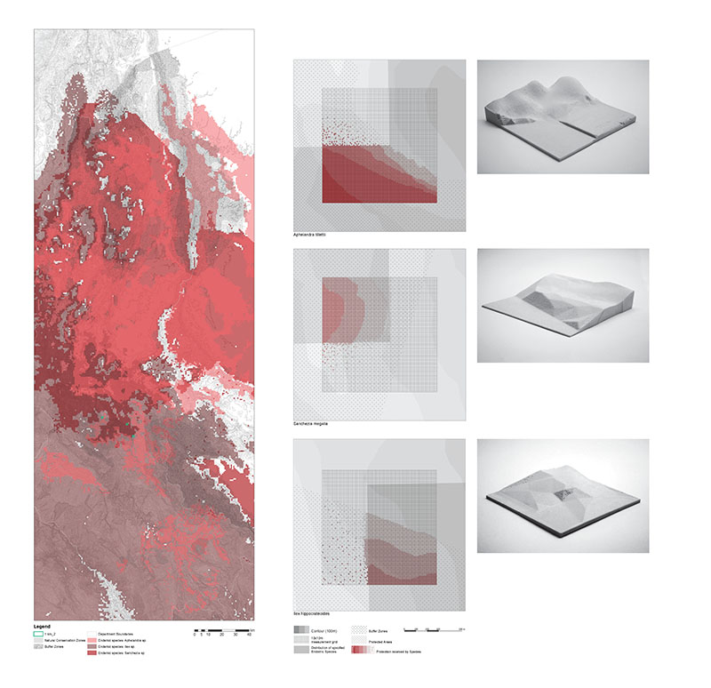 Design Analytics proposes a unique amalgam of computational design and environmental planning. Conservation and development discourse frequently decouples global-regional models from the local specifics of place. Building upon previous seminars as part of Harvard's South America Project, we critically return to the local, organic and ecologic as moments of exception and the strongest point of entry for the fields of architecture and landscape. Lectures and seminars cover design discourse on representation and computation, which is juxtaposed with critical literature on conservation and regional development programmes and the scientific technologies and instruments enabling them. Through foundational and experimental lessons in GIS, topologies, databases, complex surface creation, and data manipulation, students gain greater dexterity and control over their geometry, data types, and cross-platform workflows useful from regional to site-scale works and information visualization. Students repurpose the spatial matrix as a tool for working between complex geometry (e.g., contours, reserve boundaries, agricultural settlements) and heavy data (e.g., deforestation, endemic species distributions). Student projects culminate in densely annotated plans and 3D-printed surfaces of a one-square-kilometer section of the rainforest.